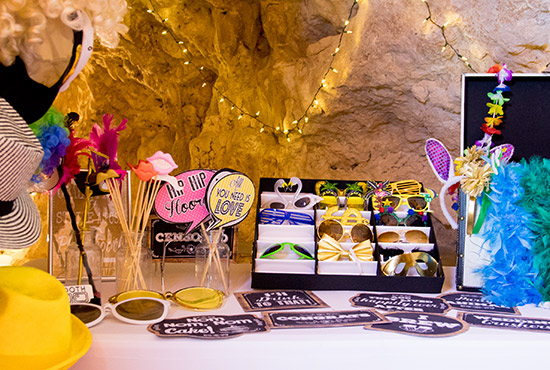 From wigs to glasses, we provide costumes and props that allow individuals to be creative and to express themselves freely in pictures. Our props are displayed on a simple and elegant table that is dressed with a black fitted cloth.
